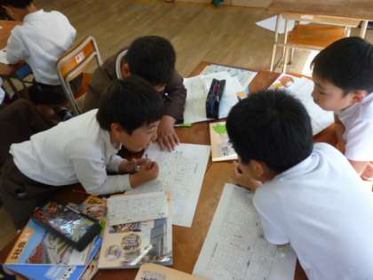 町たんけんに行った時のメモをもとに、地区ごとのグループに分かれて
