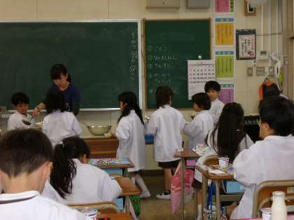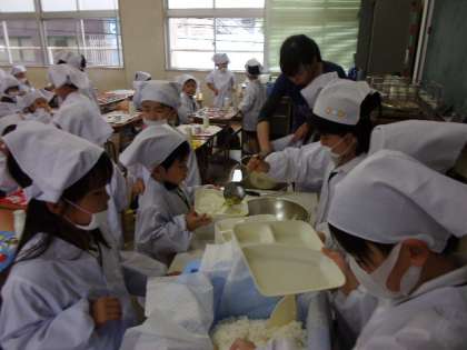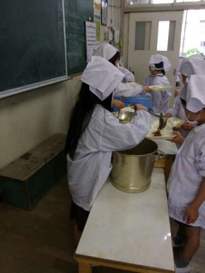 1年生も、がんばって自分たちで給食を配膳しています。しかし、全員配り終わったはずなのに、なぜかごはんもカレーも半分位残っています。今日は大好きなカレーだったので、おかわりしたい人がたくさんいて、最後は空っぽになりました。