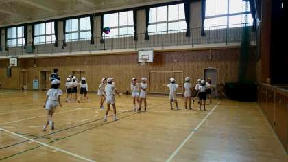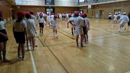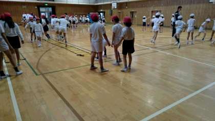 今日は雨で運動場が使用できないので、講堂で体育をしました。