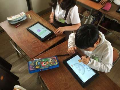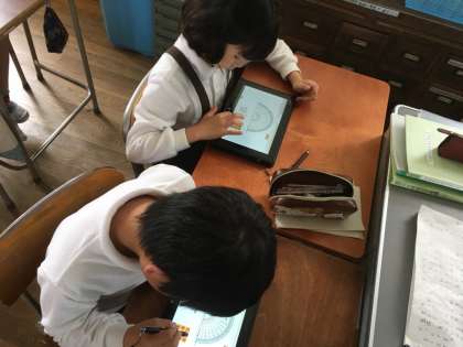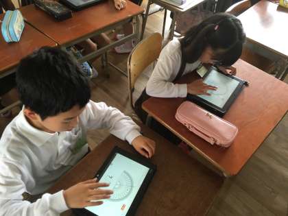この時間は、学習したことをタブレットに配信した角度ゲームで楽しく学習している様子です。
