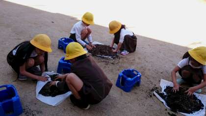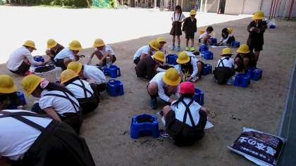 土の中から出てきた、ミミズを覗き込んだり、ダンゴ虫を見つけたりと、苗が鉢に収まるまでたくさんの発がありました。