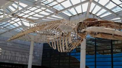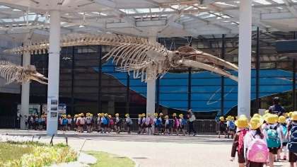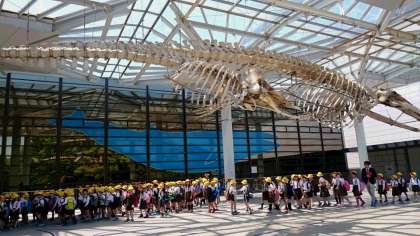 事前に学習をして「ナガスケ」(ナガスクジラ オス 骨格標本)に会えることを楽しみにしていた子どもたちは、目の当りにしてとても感激していました。