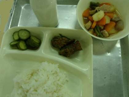 今日の献立は「ごはん、ちくわのいそべあげ、鶏肉とじゃがいもの煮もの、あっさりきゅうり、牛乳」でした。ちくわのいそべあげは、ちくわに青のりたっぷりの衣をつけて、油でからりと揚げました。あっさりきゅうりは、蒸したきゅうりに塩だけで味をつけたので、揚げ物を食べたあとの箸休めとなりました。