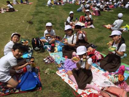 晴れた空の下、友達と仲良くお弁当を食べました。