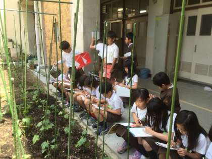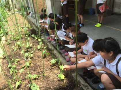 学習園にあるヘチマとヒョウタンの苗を観察しに行きました。苗の様子をノートに一生懸命、記録していました。