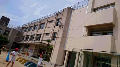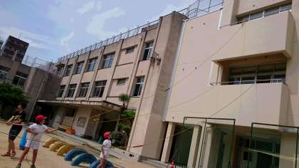 ソフトボール投げの距離が伸びるように、この教具を使用して体で覚える学習をしています。