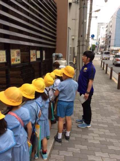 町探検にいきました。この写真は大阪ECO海洋動物専門学校を見学している様子です。