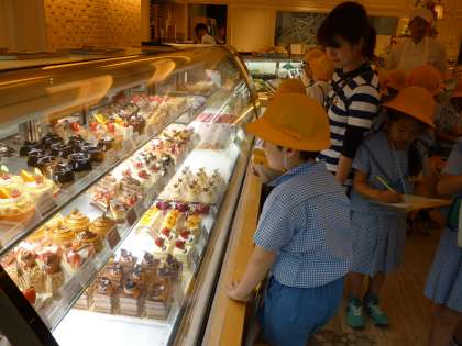 ケーキ屋ル・ピノーの店内を見させていただきました。色んな種類のケーキが並んでいます。
