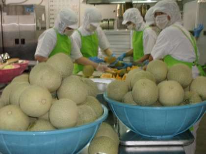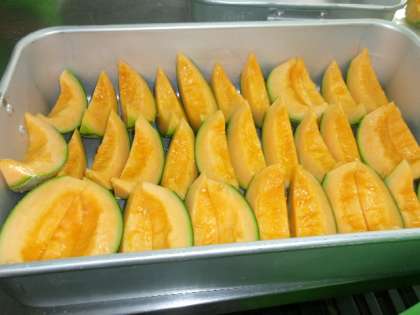 今日の献立は「コッペパン、はちみつ、カレードリア、キャベツのスープ、クインシーメロン、牛乳」でした。クインシーメロンは、食べごろのとっても甘いメロンでした。堀江小学校には、127個のメロンが届きました。給食調理員さんが、きれいに洗ってヘタと種を取って、8分の1にきれいに切り分けてくれました。カレードリアは、表面がこんがりと焦げ目がついて、食欲をそそる香りがしました。