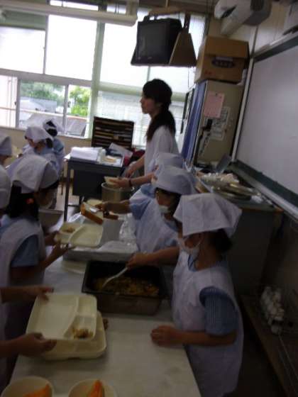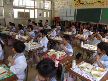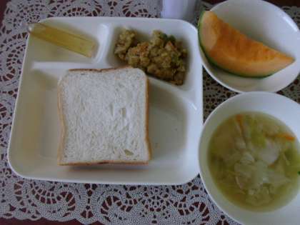 教室のメロンが運ばれてくると、甘くてとってもおいしそうなメロンの香りでいっぱいになりました。メロンは小さい食器にいれて、当番の人が配っていきます。自分の前にメロンが置かれると、子どもたちは『早く食べたいな!』という顔で、配膳が終わるのを待っていました。