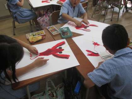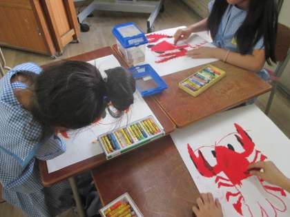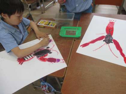 はさみのあいだにギザギザがある。体にブツブツがある。8本の足もぜんぶちがってる。など気付いたことを発表した後、強うそうなザリガニを描きました。