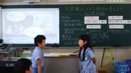 ゲストティーチャーとして、教育センターから坂口朋子先生に来て頂き、肖像権について学びました。総合的な学習などで取材することもある子どもたちに、写真を撮る、使う際のマナー、モラル、について考えさせ、実際に2人組でやってみて、今後に生かそうという学習でした。ふりかえりの時間には皆、気づいたことをしっかり書くことができました。