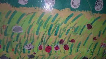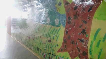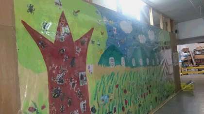 東校舎3階から講堂上の教室に行く渡り廊下に27年度の幼稚園児と1年生が合同で制作した絵を掲示しています。