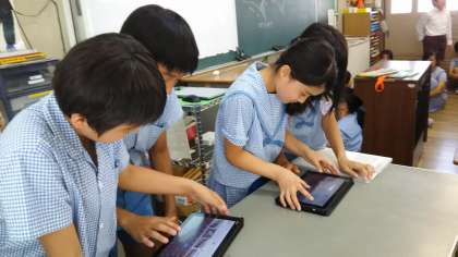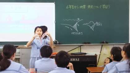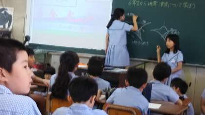 「プレート型の地震はこんなふうにして起こります。」と下敷きを2枚使って説明してくれたり、「ぼくたちも4年生の時にこの学習を始めて、みんなでパンフレットを作りました。いろいろ調べて学んできたので、何かわからないことがあったらなんでも聞いてくださいね。」とやさしく呼びかけてくれたりと、とても頼もしい6年生です。4年生が質問をする度に、映像をタブレットで急いで探してわかりやすい説明をしてくれました。さあ、4年生!先輩を見習って、いい学習を進めていきましょうね。