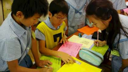 なかよしまつりに向けてのたてわり班活動です。6年生リーダーはもちろん、4年生も協力してがんばってますよ!(6月6日記事)