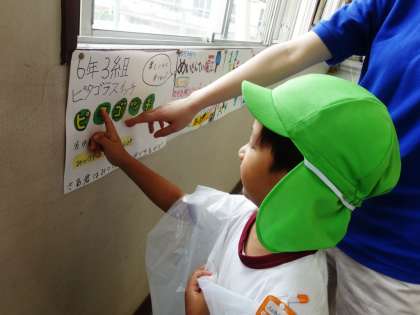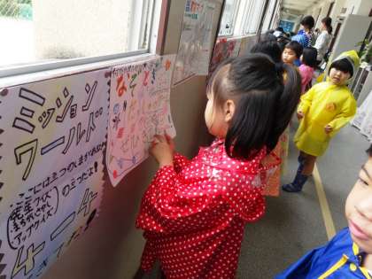 堀江幼稚園の園児たちが明日の「なかよしまつり」のお店のポスターを見に来ました。