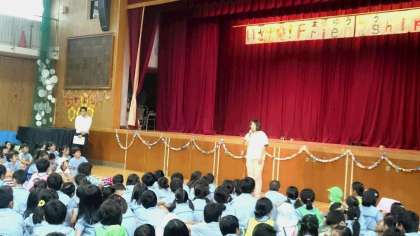 幼稚園の木下主任が幼稚園の子どもたちと一緒に、笑顔いっぱいの「なかよしまつり」にしましょうというお話をしました。
