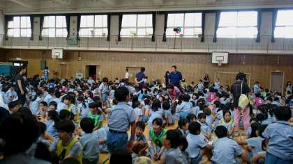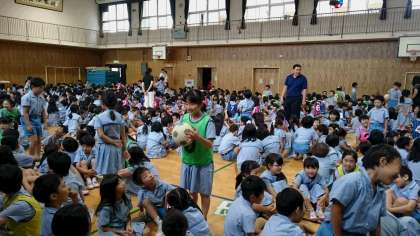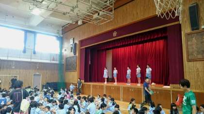 「ドン」と言った時にボールを持っていた児童は、自己紹介を行います。
