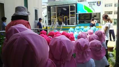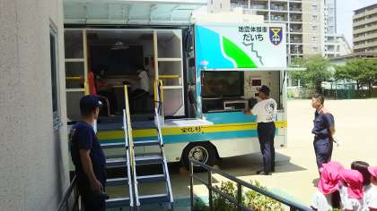 先生も体験しました。幼稚園のみんなは、先生の体が大きく揺らされる様子を見て、地震の怖さを感じとっていました。