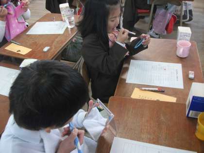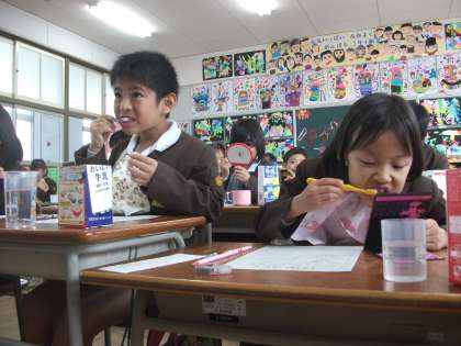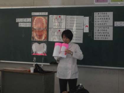 歯科衛生士さんに歯みがきの仕方を教えてもらいました。歯と歯の間や歯と歯ぐきのあいだは特にていねいにみがくようにします。