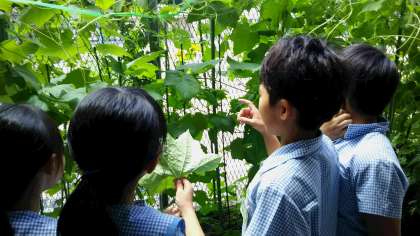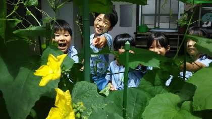 「あそこ、花が咲いてるよ!」ヘチマもヒョウタンもぐんぐん伸びています。「葉っぱが大きくなってる!」顔がかくれるぐらい大きくなった葉っぱも発見しました。