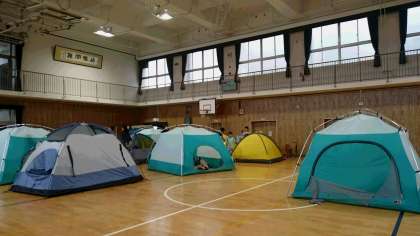 雨の校庭キャンプとなりましたが、講堂や廊下を上手く使用して、楽しいキャンプの始まりです。