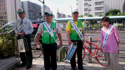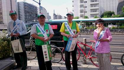 総務省の取組である「社会を明るくする運動」について、「西地区保護司会」の方が、啓発活動を行っておられました。合わせて、子どもたちの登校の見守りも行ってくださいました。