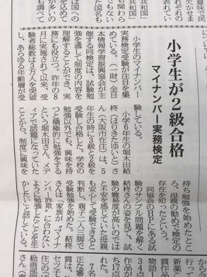 小学生のマイナンバー実務検定受験が注目を集めている中、6年生の児童が3級・2級を受検し、合格したことが、新聞で紹介されました。
