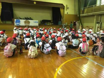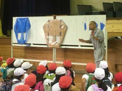 避難訓練を終えて、今から凧作りの説明を受けます。