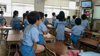 毎週水曜日、朝8時35分から教室のテレビで背筋ピーン体操を放送しています。