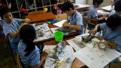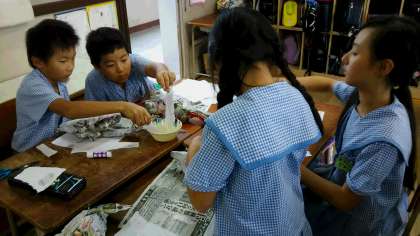 新聞紙をまるめる土台は、芯材がないので難しく、思うような形にするのに苦戦していましたが、かわいい魚が出来上がりました。皆、着色にもこだわっていました。大きな口は、小物が入れられるように工夫されています。151匹が講堂で泳いでいます。お楽しみに。