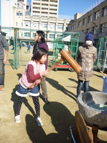 児童も大勢集まってもちつきをしました。今はなかなか上手につけないけど、毎年毎年参加していると、一人前になれるぞ!
