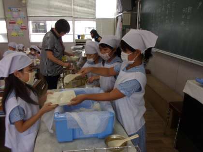 2年生の教室では配膳が終わった後、きゅうりともやしのあえものがたくさん残っていました。「もう少し食べる人はいますか?」と先生が聞くと、たくさん手があがりました。ホイコウローもピーマンの大切りが入っていたので、減らす人もいましたが、おかわりをする人もたくさんいて空っぽになりました。