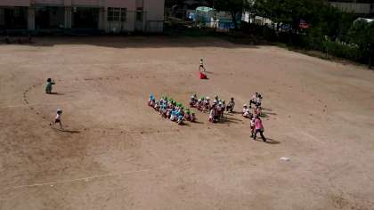 小学生が給食を食べている時間を利用して、堀江幼稚園の園児が運動会の練習をしています。