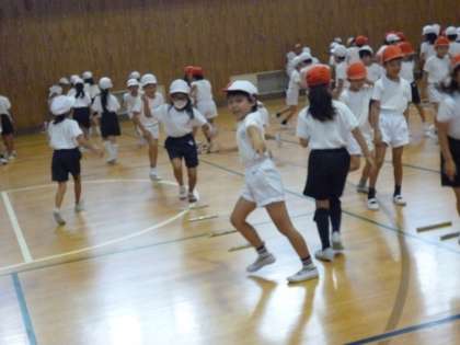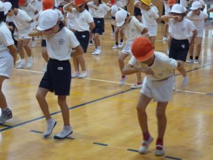 今日は、講堂で隊形移動の練習をしました。各クラス4列並びから、各クラス二重円になります。ダンスは、かっこよく踊れています。