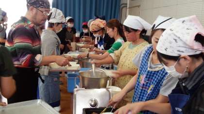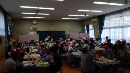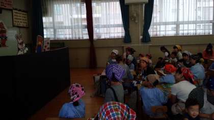 幼小連携活動の一貫として、幼稚園年長児と保護者の方々に小学校の給食を味わってもらいました。最初に、幼稚園の先生方、堀江小学校の栄養教諭、実習生で「くまくんのおなか」というペープサートの劇をしました。給食を作ってくださっているコック食品の給食調理員さんのお話も聞きました。そしてその後、みんなで「いただきます。」をしました。今日のメニューの「ごはん、和風おろしハンバーグ、みそ汁、かぼちゃのいとこ煮、牛乳」のお味はいかがでしたか?