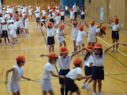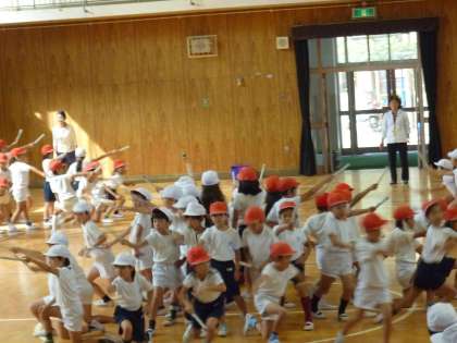 今日は、講堂で団体演技「ほりえNinjya参上」、運動場で「ひっぱれ!タイヤくん!」「かけっこ」の練習をしました。