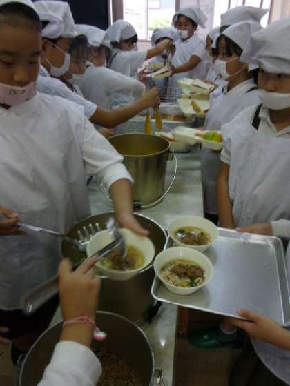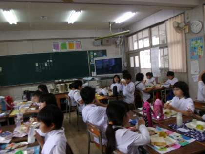 3年生は4時間目の運動会の練習をぎりぎりまでがんばったので、大急ぎで配膳をしました。3年生ともなると、みんなで協力して短時間できれいに配膳ができます。「いただきます。」をした後も、今日はずっともぐもぐタイムということで、だまって集中して給食を食べていました。タンタンめんは大人気でした。