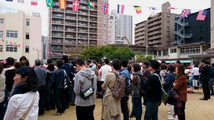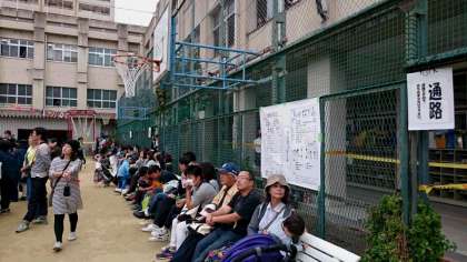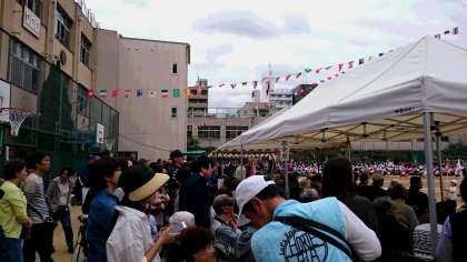 昨年よりも児童数が増えていますので、写真のような状態の中で、少しでも見やすさを確保していただくために、今回は競技中の児童席を開放してその学年の方に観ていただきました。