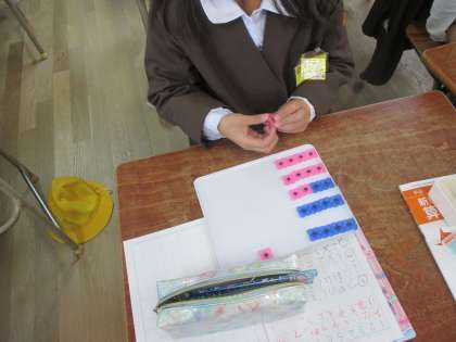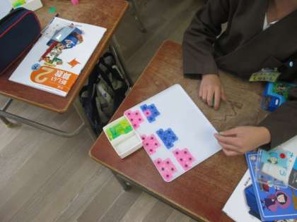 算数「かけ算」の学習で、かけ算の式をおはじきで表しました。友だちと問題の出し合いもして、かけ算の式の理解を深めました。