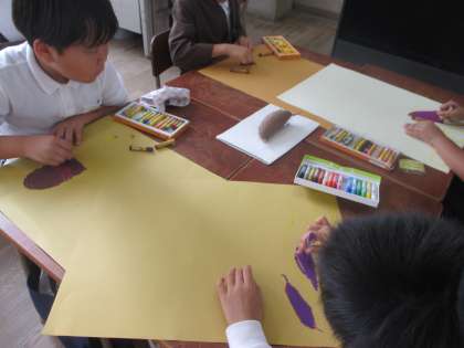 学習園でそだって収穫したいもの絵をかきました。グループで1つじっくり眺めながらていねいに描きました。「紫色に黄色を混ぜるとそっくりの色ができたよ。」「皮のむけたところは色がちがう。」「ひげもついてる。」楽しそうに描きました。