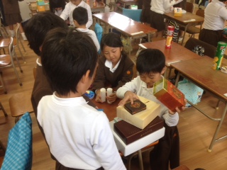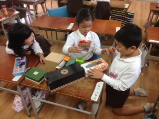 様々な形の箱や筒を使って、いろいろなものを作りました。