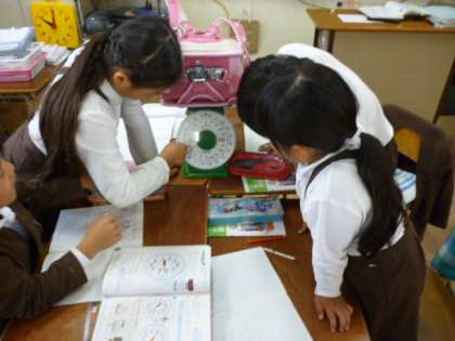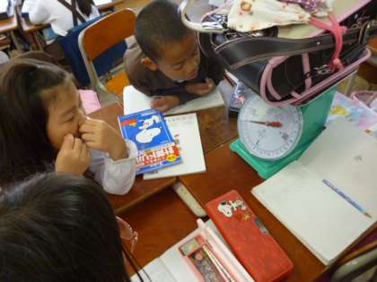 算数の授業ではかりを使ってランドセルの重さを量りました。