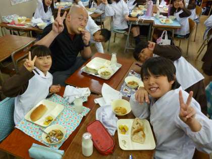 給食の時間に、英語の先生であるパトリック先生が来てくれました。