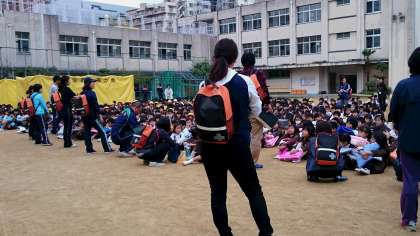 各教室に常設している「災害時持ち出しリュック」を背負って避難します。