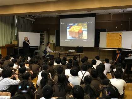 今日は出前授業で将棋を教えていただきました。大きな将棋の駒を使って「歩」だけを使った遊びや、代表の児童と対局したりしました。先生からの楽しいお話もたくさん聞くことができ、楽しい時間を過ごしました!