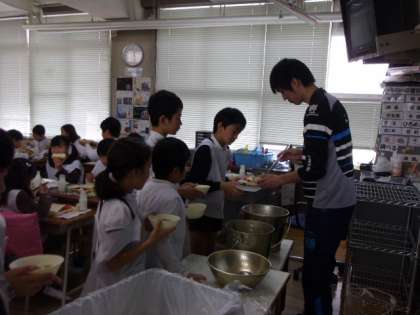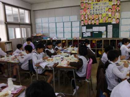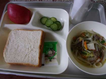 今日は、みんな大好きな肉うどんでした。配膳が終わって「いただきます」をして食缶をのぞくと、少し残っています。先生が「もう少し食べられる人」と聞くと、たくさんの人が出てきておかわりをしました。パンもきゅうりもりんごも牛乳も、みんななくなりました。