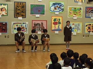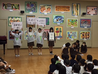 本日、堀江幼稚園に健康委員会の児童が「自分たちでできるけがの手当て」の劇&クイズの発表をしました。最初は緊張した様子でしたが、園児たちが真剣に見てくれていたので、楽しく発表できました。