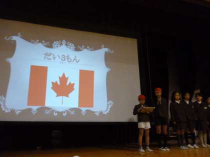 なかよし班で講堂に集まって、みんなで国旗あてをしました。「この国旗はどこの国ですか?」 日本、カナダ、中国、ブラジル・・・・全部答えられた子は何人いるかな。
