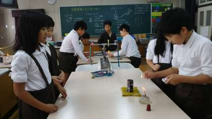 ものの温まり方を学習していきます。これから安全に実験できるよう、アルコールランプやガスバーナーの正しい使い方を確かめ、順に練習しました。また、閉じ込めた空気を温めるとどうなるのか、熱湯を使って実験しました。